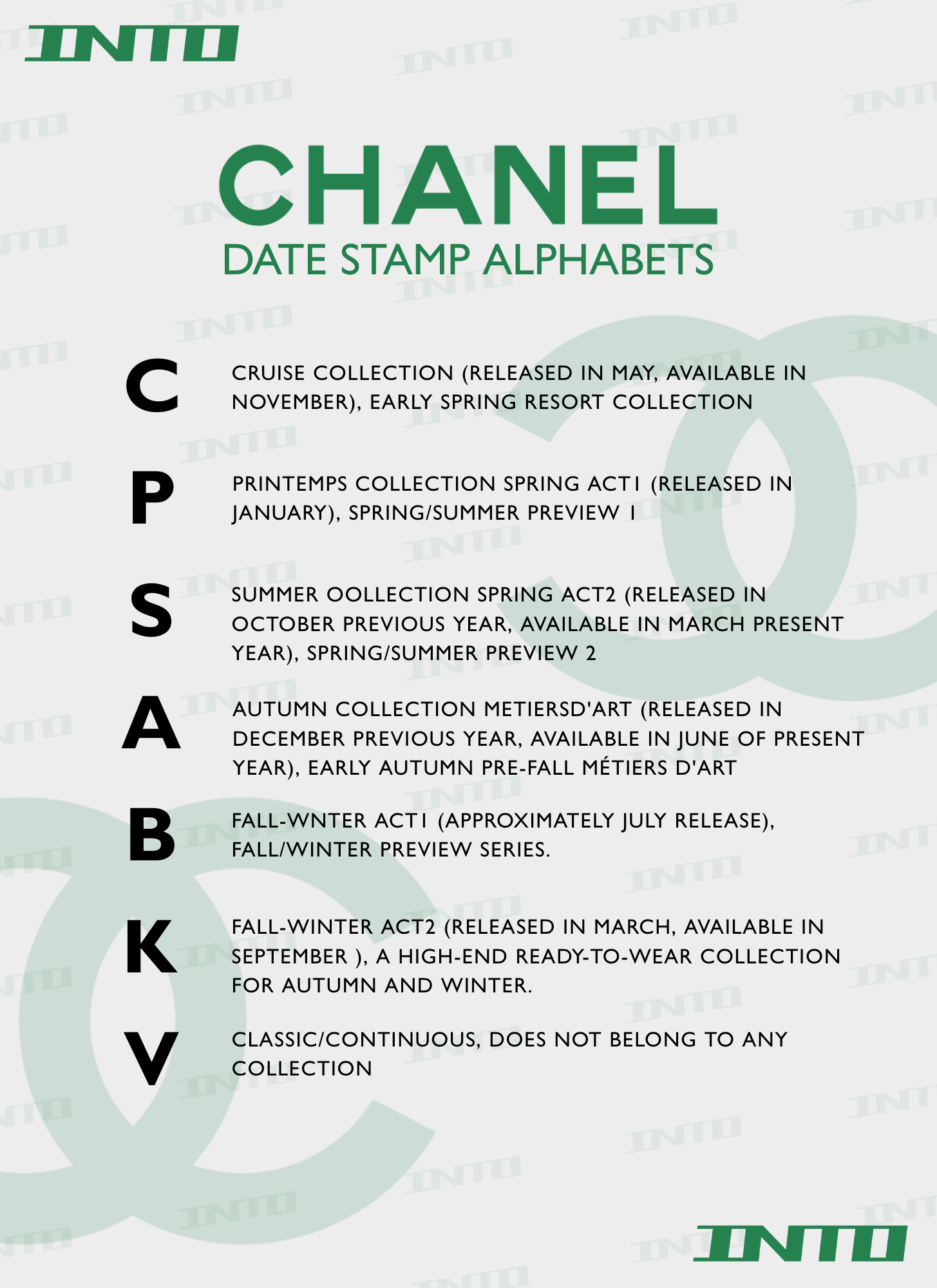 On many Chanel pieces—especially ready-to-wear, shoes, and accessories—you’ll find a single letter alongside the seasonal code. That letter isn’t random: it maps to the collection season and delivery window, helping you understand when an item was produced and which collection it belongs to. Paired with other identifiers (materials, construction details, and, where applicable, serial codes), it’s a powerful cross-check for authenticity and accurate dating.