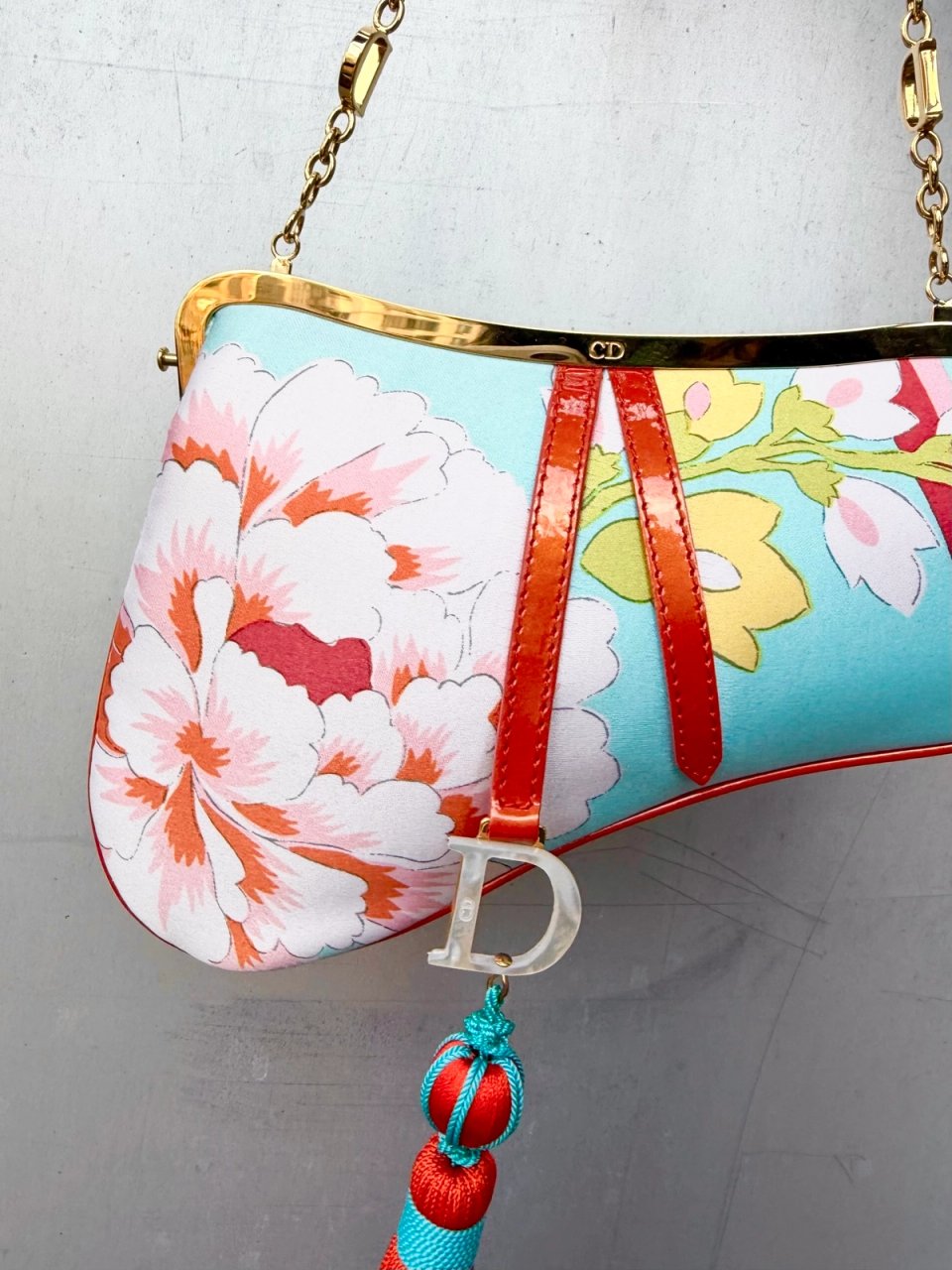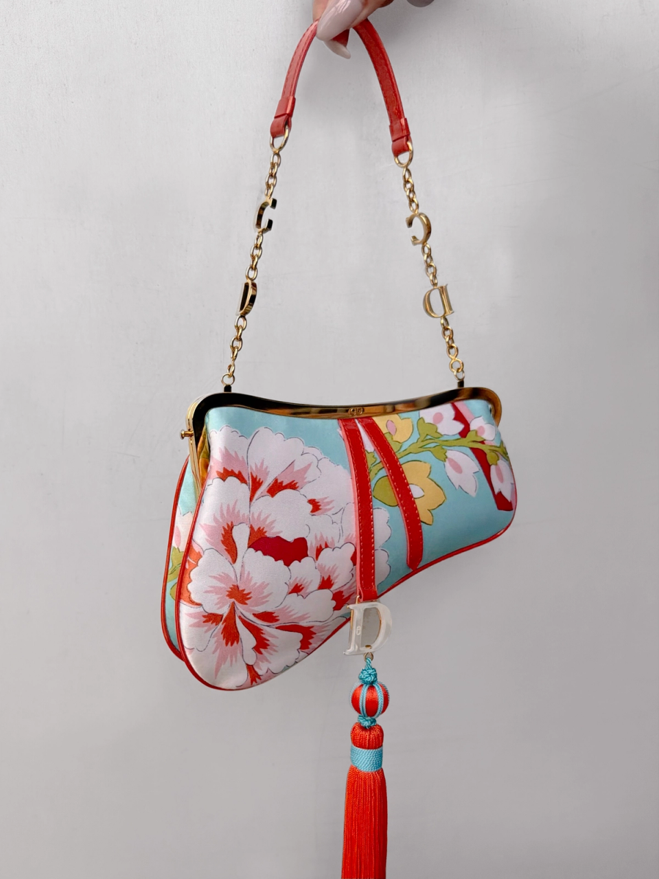 From the Fall-Winter 2003 Christian Dior collection, this limited edition saddle bag is designed with a silk exterior. It features a blue base with an oriental floral motif print throughout. The bag has a metal frame closure engraved with the CD logo, a Dior D metal logo accent at the front with an oriental motif tassel below, a looping CD chain link and strap with a leather shoulder pad and gold-tone metal hardware.