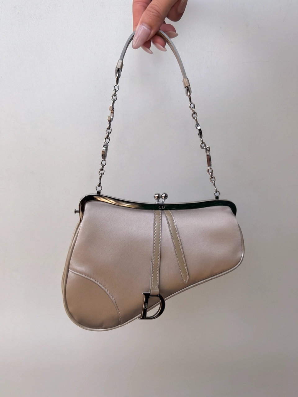 From the 2002 Christian Dior collection by John Galliano, this saddle bag is designed out of satin in a taupe silver tone with matching patent leather trim. It features a mini saddle bag silhouette with a metal frame closure engraved with the CD logo. The bag is accented with the Dior D metal logo at the front, a looping CD chain link and strap with a leather shoulder pad, and silver metal hardware. Has minor signs of wear.