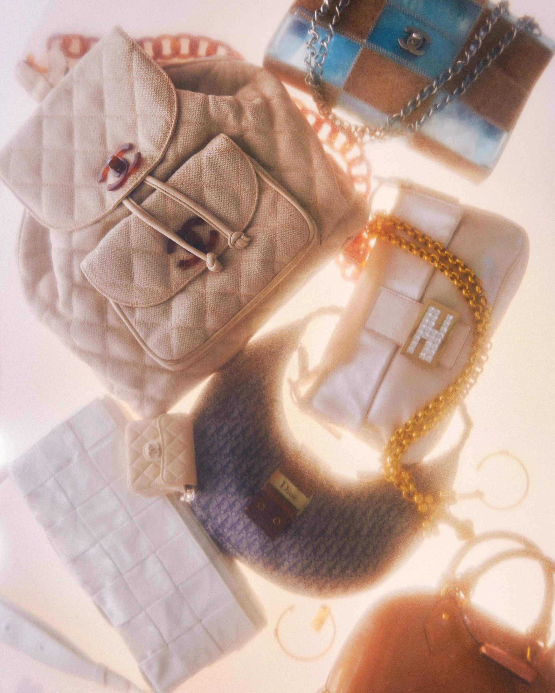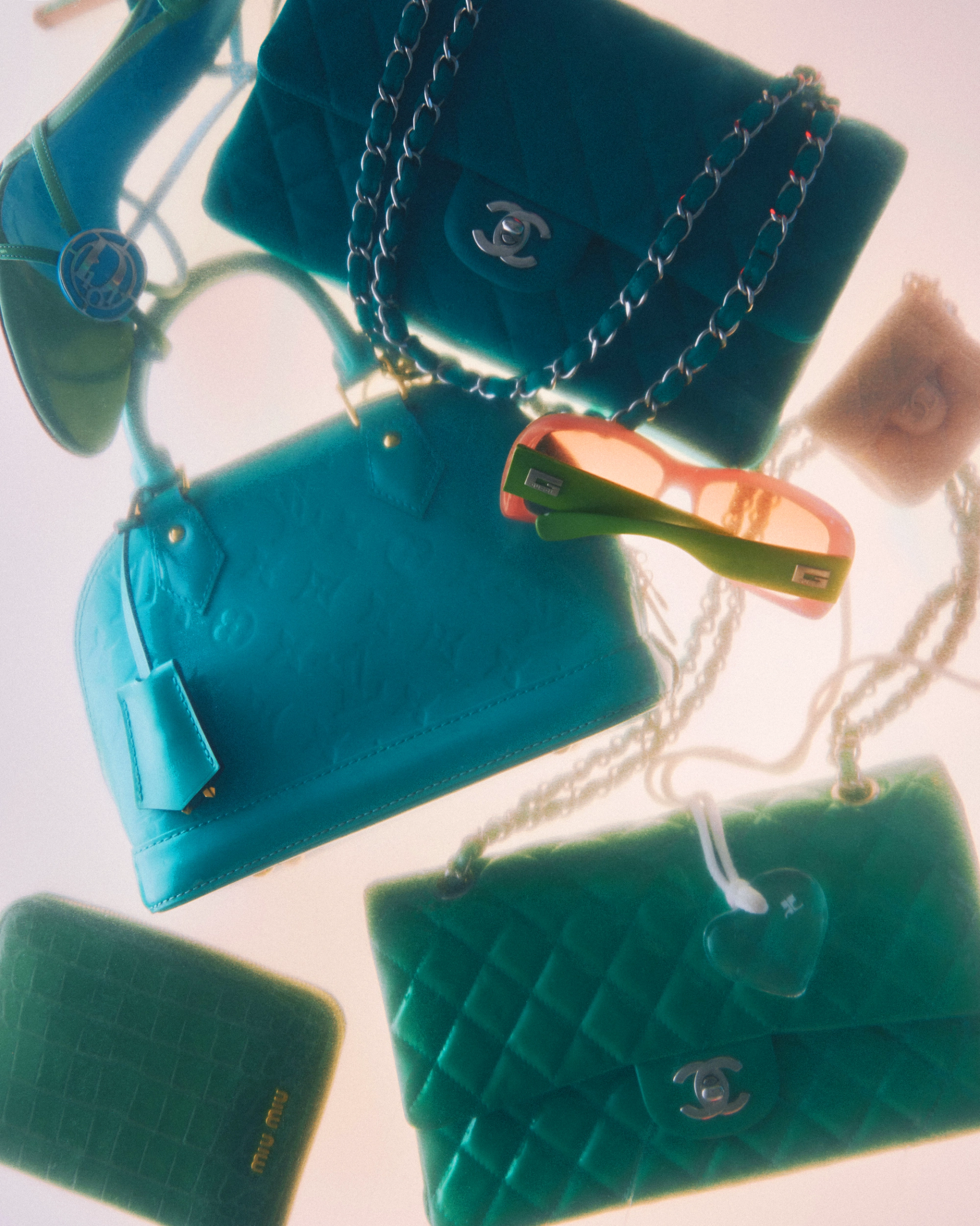 Into Archive dives into an aquatic daydream with @nelsonhuang: a still-life series staged under tinted glass to evoke an “underwater” world where color leads the story. Each scene groups collectible pieces by hue—green, pink, beige—for a modern, monochrome treasure hunt that nods to the I Spy books of the early 2000s. Shimmering vinyl, polished leather, and textured canvas refract light like sea glass, turning bags, jewelry, and trinkets into gleaming artifacts. The effect is playful and archival at once: familiar house codes seen through a new lens, arranged to reward looking twice.