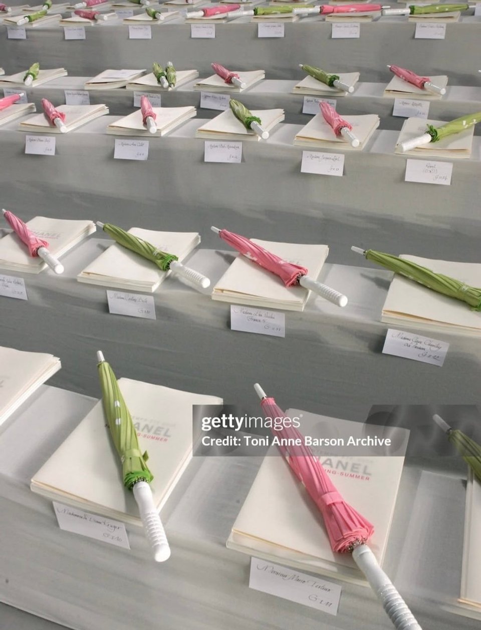 The archival photos from the Toni Anne Barson Archive show the incredible precision of the era. Each umbrella sat atop a thick white press kit, paired with a hand-lettered card. One of those cards belonged to Mademoiselle Diane Kruger, the German actress and longtime house muse.