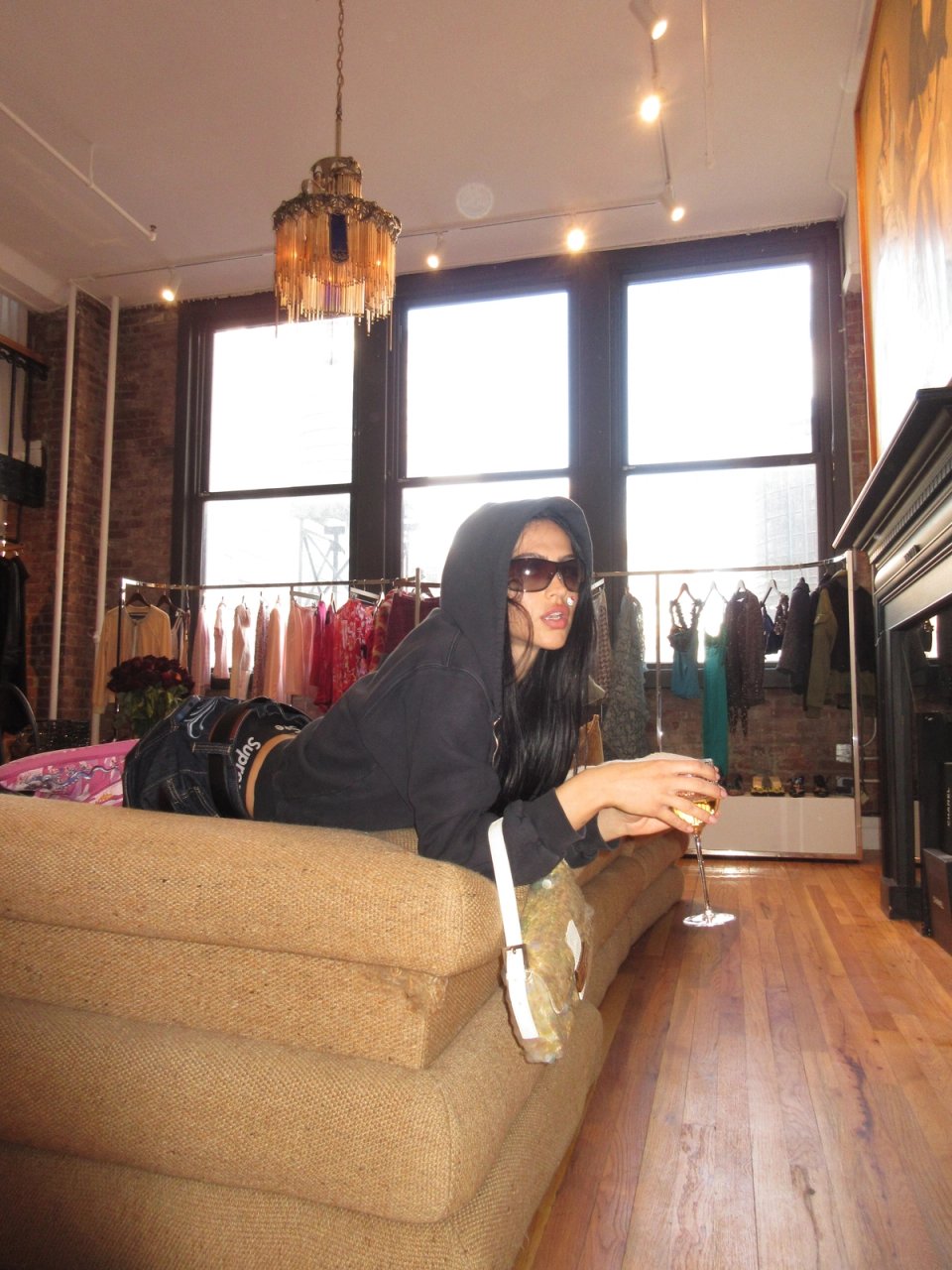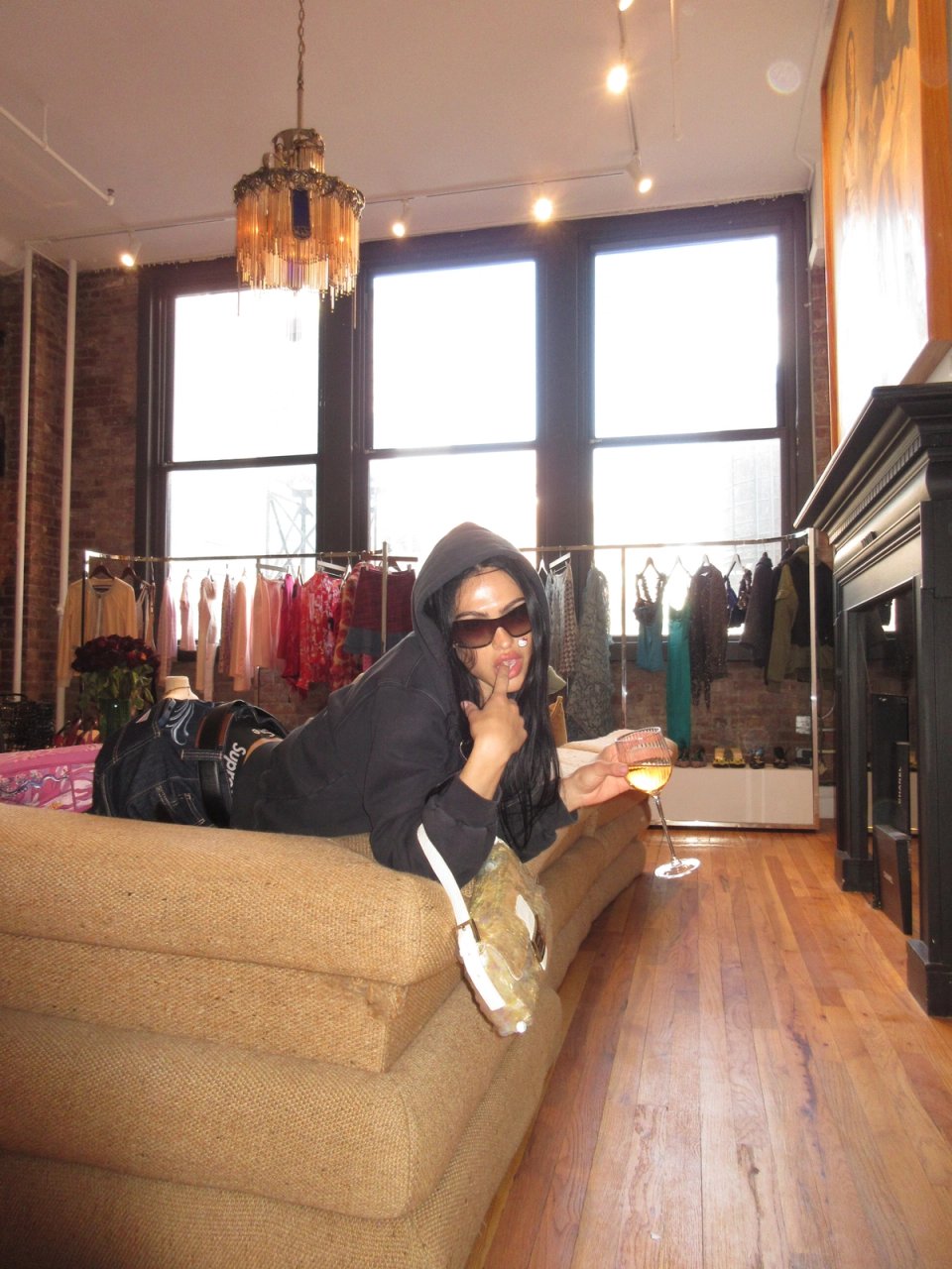 Between sips of white wine and a casual sprawl across our linen modular, Amelia reminded us why she’s the ultimate muse of the moment. Dressed in her signature uniform—a cropped black hoodie, low-slung denim revealing a peek of Supreme elastic, and those omnipresent oversized shades—she spent the afternoon browsing through our upcoming archives.