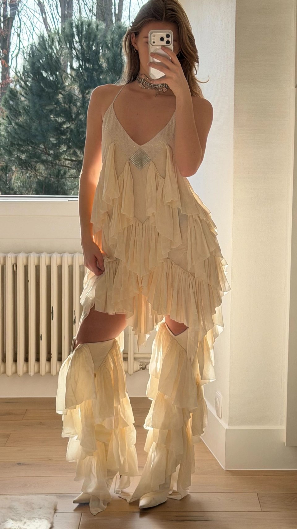 Whether it's the way the hand-pleated silk catches the wind or how the ruffled boots create a gravity-defying leg line, this piece isn't just clothing—it’s a performance. In the universe of Alexandre Vauthier, revenge isn't just a dish best served cold; it’s best served in hand-stitched chiffon and a cloud of crystals.